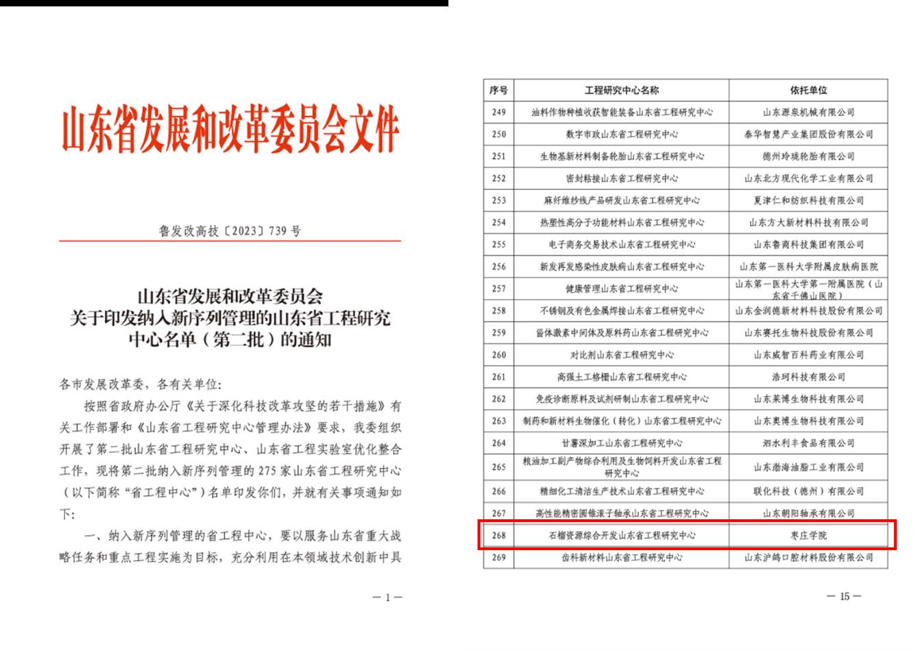 近日,山东省发展和改革委员会发布《关于印发纳入新序列管理的山东省工程研究中心名单(第二批)的通知》(鲁发改高技(2023) 739号)。其中,由beat365官网beat365平台唯一官网牵头建设的“石榴资源综合开发山东省工程研究中心”顺利通过阶段考核并纳入新序列管理。