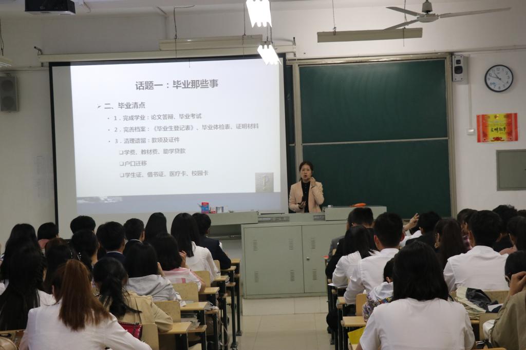 讲座围绕“谈现在:毕业那些事”,“说未来:前途那些事”两方面展开。主要包括:一、做好毕业清点:完成规定学业、完善档案、清理遗留。二、解读毕业政策,分析就业手续流程图。详细讲解就业报到、调整手续、改派手续、档案转递等工作。三、分析当前的就业形势,用人单位对不同人才的需求情况,现行大学生就业制度以及beat365官网近几年的就业数据。四、发展才是硬道理。要培养自己的时间管理能力,找到自己的核心竞争力,提升自我管理能力,进而做最好的自己。