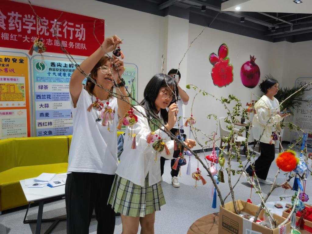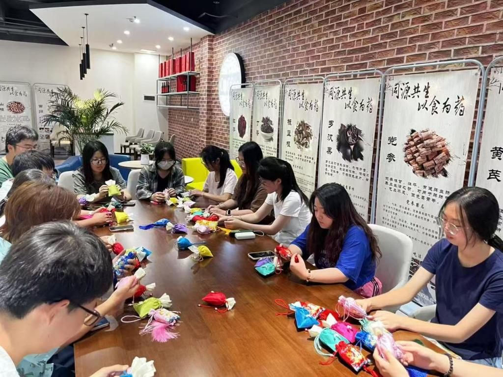 活动现场,学院专业教师带领同学们辨识艾叶、薄荷、陈皮、丁香等中药材,讲解其药理功效与配伍文化:“艾叶驱寒安神,薄荷醒脑舒缓,这些药材不仅可入药入膳,更能通过香气调节情绪。”同学们在指导下精心调配香料,缝制出兼具功效与美感的端午香囊。一针一线间,传统技艺的匠心与药食文化的智慧悄然流淌。