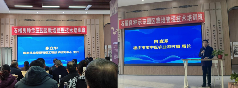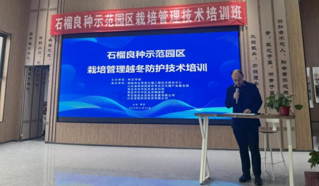 为加强石榴良种示范推广,提升北方地区石榴种植越冬抗寒技术水平,推动中央财政林业草原推广示范项目的实施进展,,由枣庄学院主办,国家林业草原石榴工程技术研究中心、山东省科技特派员枣庄市石榴产业服务团、枣庄市市中区农业农村局、永安镇政府等单位联合承办的“石榴良种示范园区栽培管理越冬防护技术培训”近日在枣庄市市中区永安镇顺利举行。