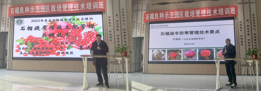 姜远茂教授围绕“石榴提质增效土肥管理关键技术”展开系统讲解,尹燕雷研究员则重点讲授了“石榴越冬防寒管理技术要点”。两位专家结合北方气候特点与石榴生长特性,深入浅出地阐述了土肥调控、树势增强、防寒保温等实用技术,并现场解答了种植户提出的问题。