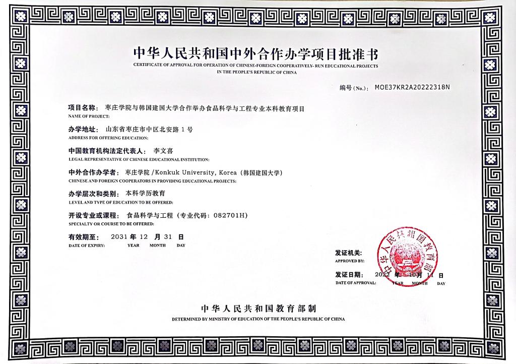 枣庄学院与韩国建国大学(Konkuk University, Korea)合作举办食品科学与工程专业本科教育项目是两校通过整合优势资源,共创深度融合,合作共建的中外合作办学项目,于2022年10月正式获得教育部批准举办(教外函[2022]45号),批准书编号MOE37KR2A20222318N。项目于2023年开始招生,目前在校生188人。