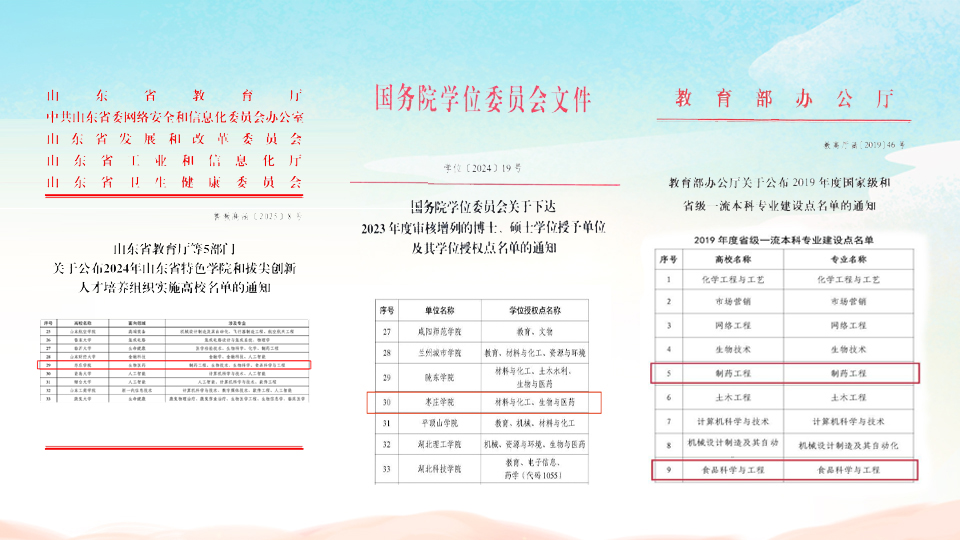 师资力量与办学条件雄厚:学院现有教职工78人,设有食品科学与工程、食品质量与安全、制药工程和生物制药4个教研室,专任教师62人,全部具有硕士及以上学位,其中博士57人,副教授以上26人。党委成员7人,下设四个党支部,师生党员107人。专任教师队伍中博士占比超过85%,拥有省级人才多名,山东省第二批“高校黄大年式教师团队”1个。目前有硕士生导师27名,博士生导师1名。实验实训教学条件较完备,与生命科学学院共享使用1万多平方的实验楼,实验室为山东省高等学校实验教学示范中心,设有20余个专业实验室,还设有多个专业实训室,仪器设备总价值3000余万元,并在校内建有药用植物园一处。
