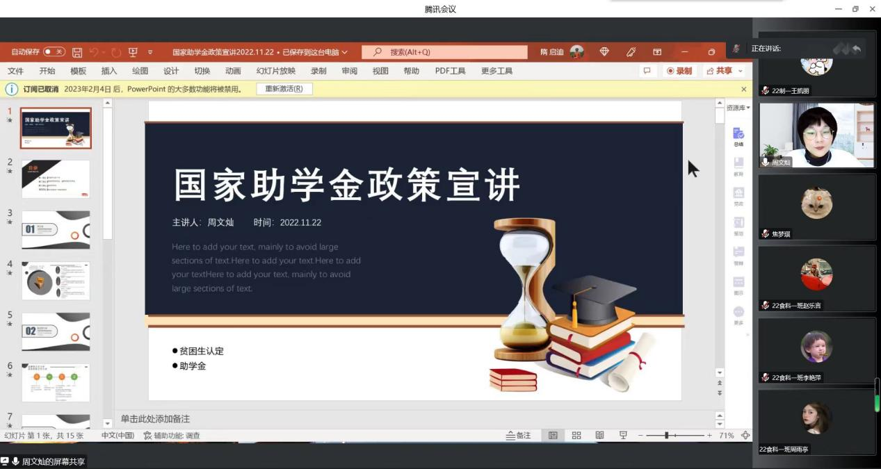 为全面推进资助育人,增强资助政策的宣传力度,增进学生对资助政策的了解和认识,beat365平台唯一官网于11月22日在线上举办国家助学金政策宣讲会。本次会议由学院辅导员周文灿老师担任主讲,2022级全体学生参加。