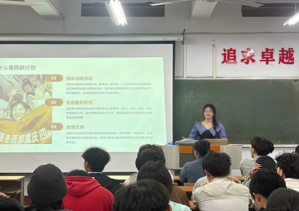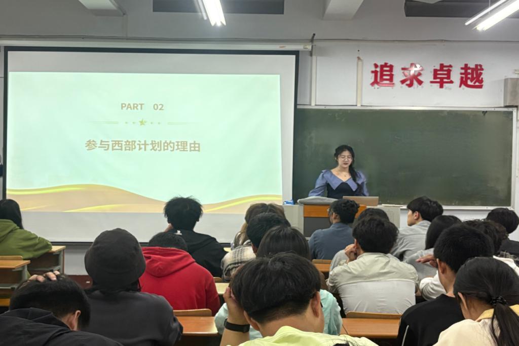 宣讲会通过政策解读向广大青年学子介绍西部计划的重大意义、服务内容和政策保障,结合对西部计划案例的深度剖析,激发青年学子到西部去、到基层去、到祖国最需要的地方去的热情。贾艳荣分享自己在志愿服务时所亲历的志愿生活、服务地详情、生活保障和风土人情,通过一张张真实的图片,同学们对参加西部计划的意义有了深入理解,并纷纷表示了自己想要投身西部、服务西部的志向。