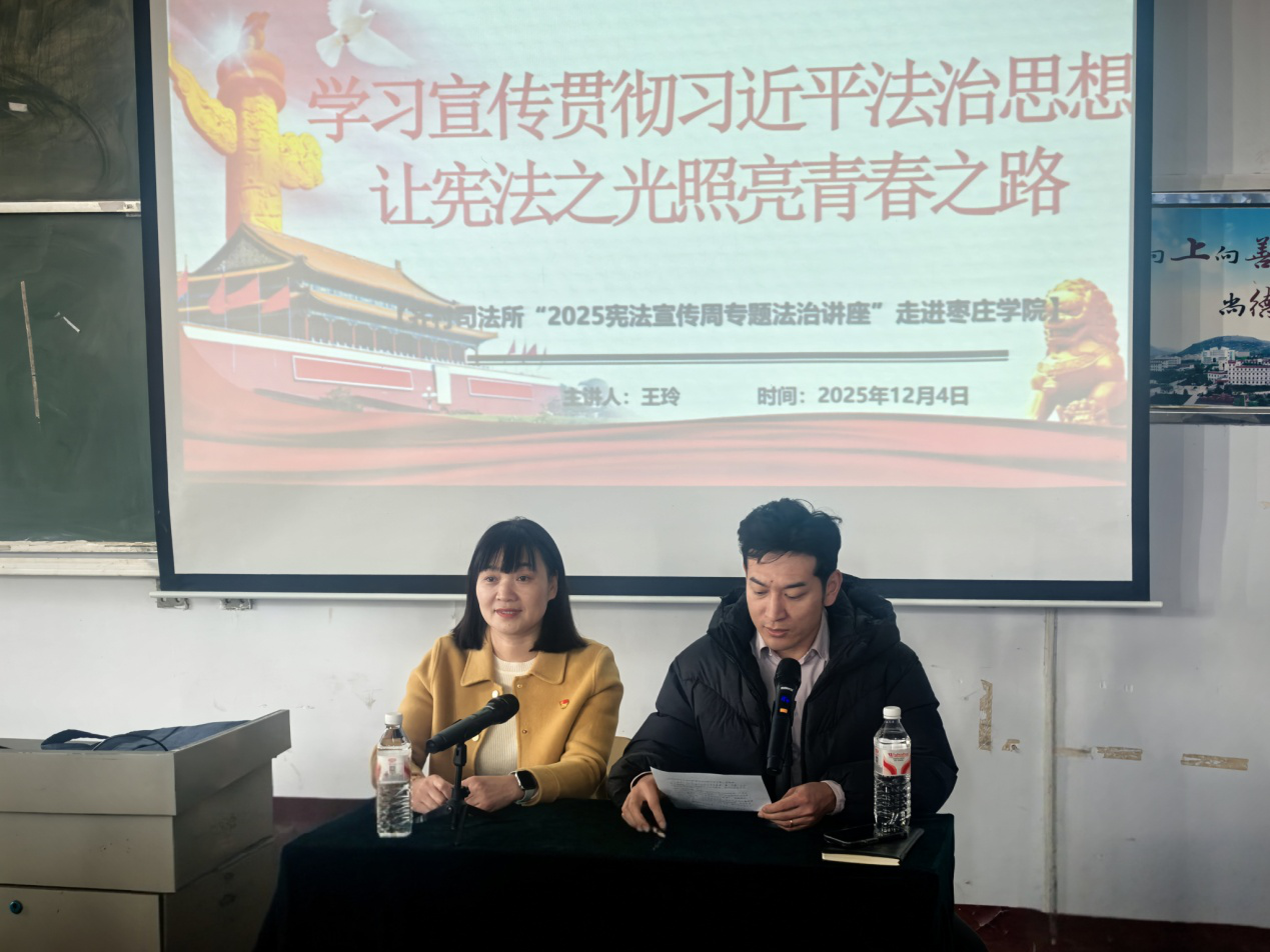 12月4日是第十二个“国家宪法日”,又正值第八个“宪法宣传周”。为深入学习宣传宪法、弘扬宪法精神,beat365平台唯一官网团委在文科楼举办 “学习贯彻习近平法治思想,让宪法之光照亮青春之路”主题法治讲座。本次讲座特邀齐村镇司法所王玲所长担任主讲。