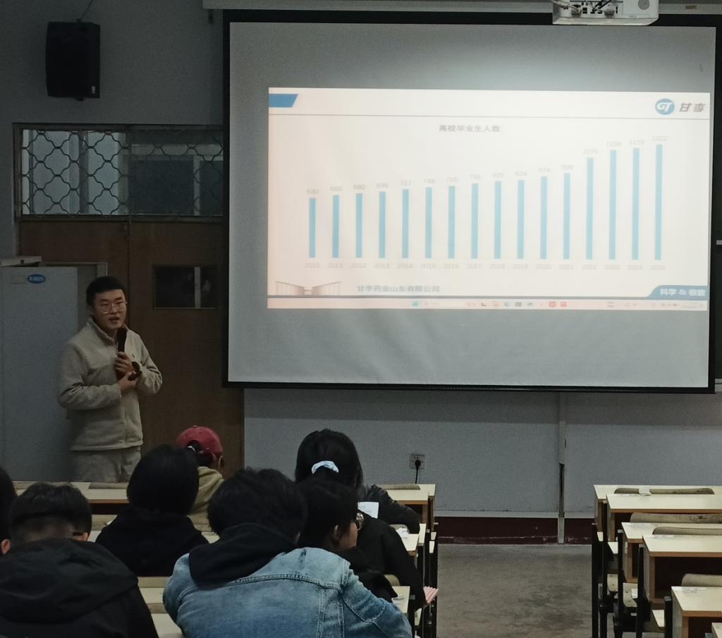 宣讲会上,杨洪顺深入浅出地介绍了甘李药业山东企业有限公司的基本情况,通过PPT演示、案例分享等形式,向在场学生全面介绍了企业的发展历程、核心业务、技术优势及行业前景。此外,杨经理从企业的研发实力、产品布局,到人才培养体系、薪酬福利政策及招聘岗位需求,进行了细致讲解,并结合自身从业经历,为学生们提供了职业规划建议。对于应聘流程及方式,杨经理也进行了清晰说明,并鼓励学生们积极投递简历。