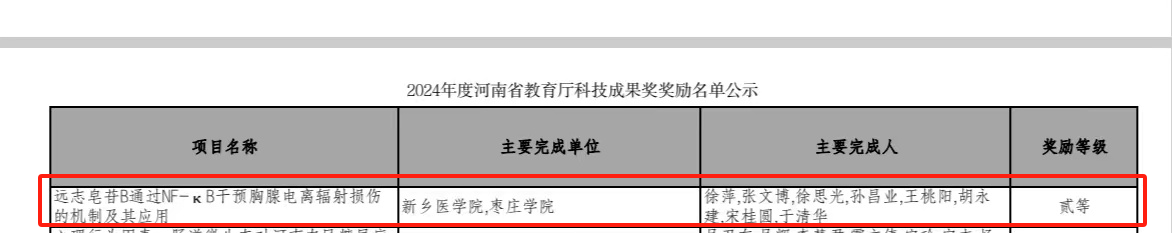 beat365官网beat365平台唯一官网高层次专家人才徐萍教授与新乡医学院联合申报的“远志皂苷B通过 NF-κB干预胸腺电离辐射损伤的机制及其应用”项目获二等奖,徐萍为该项目负责人,第一获奖人。