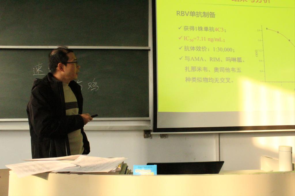 报告会上,王照鹏以食品中抗病毒药物残留检测为切入点,介绍了抗病毒药物金刚烷胺和利巴韦林在畜禽生产中的应用和药物残留现状,并对药物残留快速检测方法的研究现状和前景展开论述。会后,王照鹏与师生们进行了深入交流,并对师生们提出的问题做出了耐心解答。