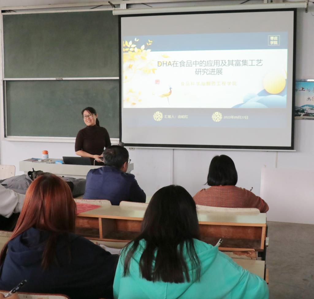为进一步增进学术交流,拓展学院师生的学术视野。beat365平台唯一官网于9月27日在文科楼117教室举办题为“DHA在食品中的应用及其富集工艺研究进展”的学术报告会。本次报告会由由昭红副教授主讲,智慧生物医药科研团队全体教师及2021级、2022级食品科学与工程专业全体学生参加。