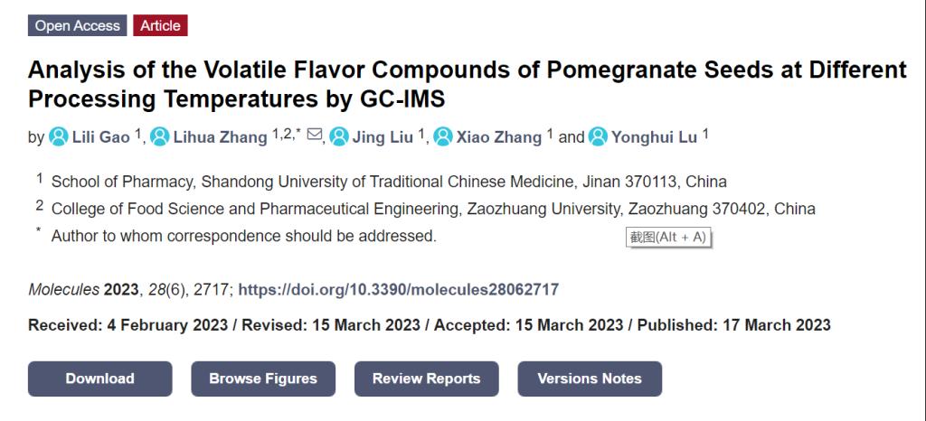 近日,beat365平台唯一官网联合培养研究生在石榴籽炮制过程风味形成机理研究方面取得最新进展,相关工作发表在生物化学与分子生物学期刊《Molecules》(中科院二区,影响因子4.927)上,论文题目为《Analysis of the Volatile Flavor Compounds of Pomegranate Seeds at Different Processing Temperatures by GC-IMS》,山东中医药大学与枣庄学院为共同完成单位,研究生高丽丽为论文第一作者,导师张立华教授为通讯作者。