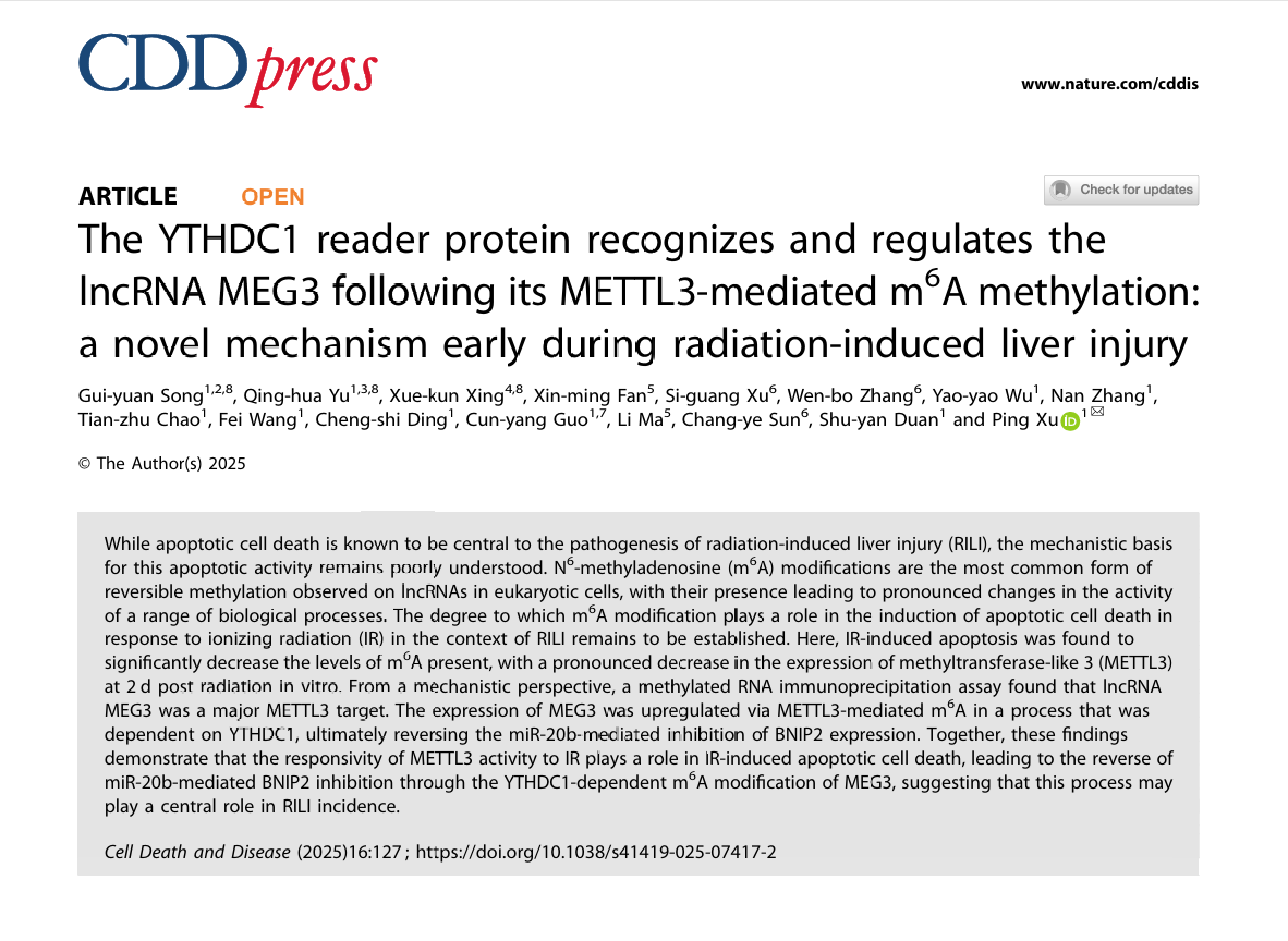 近日,枣庄学院枣庄市放射损伤疾病与分子靶向药物重点实验室徐萍教授团队在国际权威学术期刊Nature子刊《Cell Death & Disease》(中国科学院一区,TOP期刊,IF=8.1)杂志,以研究论文形式在线发表题为《The YTHDC1 reader protein recognizes and regulates the lncRNA MEG3 following its METTL3-mediated m6A methylation: a novel mechanism early during radiation-induced liver injury》的原创性研究成果,该研究报道了放射性肝损伤早期进程中RNA表观遗传与转录后调控的协同作用机制。宋桂圆硕士为第一作者,徐萍教授为独立通讯作者,枣庄学院为第一作者和通讯作者单位。该研究受国家自然科学基金、枣庄学院高层次专家人才团队建设基金等项目支持。