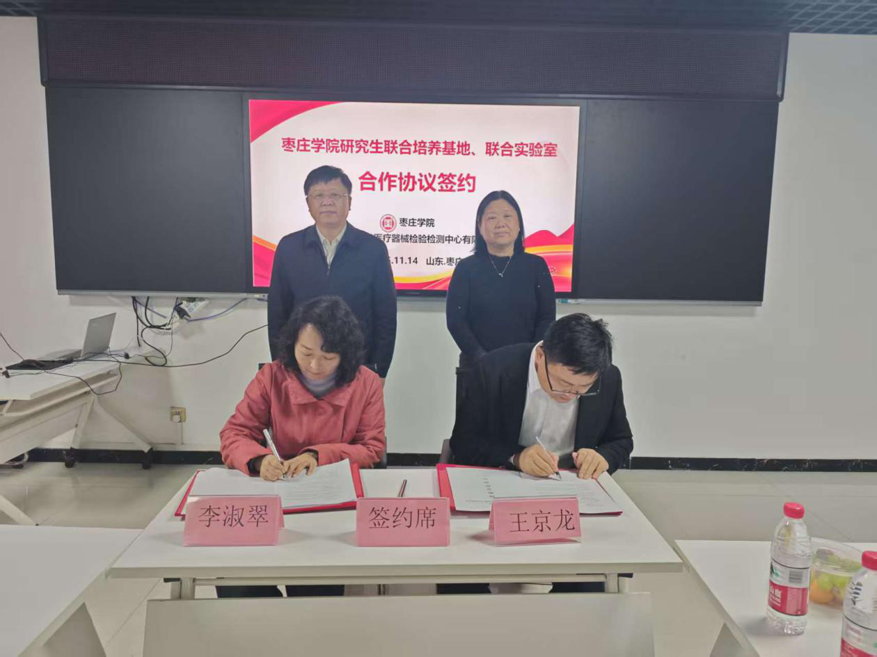 2025年11月14日下午,由枣庄学院与山东邦众医疗器械检验检测中心有限公司联合主办的“大健康产业学术沙龙暨枣庄学院研究生联合培养基地、联合实验室揭牌仪式”在枣庄高新区新医药产业园综合办公楼三楼会议室隆重举行。校党委委员、副校长李目海,山东邦众总经理李淑翠出席活动。beat365官网beat365平台唯一官网院长王京龙、健康工程技术研究院院长韦德泉和部分教师代表参加活动。