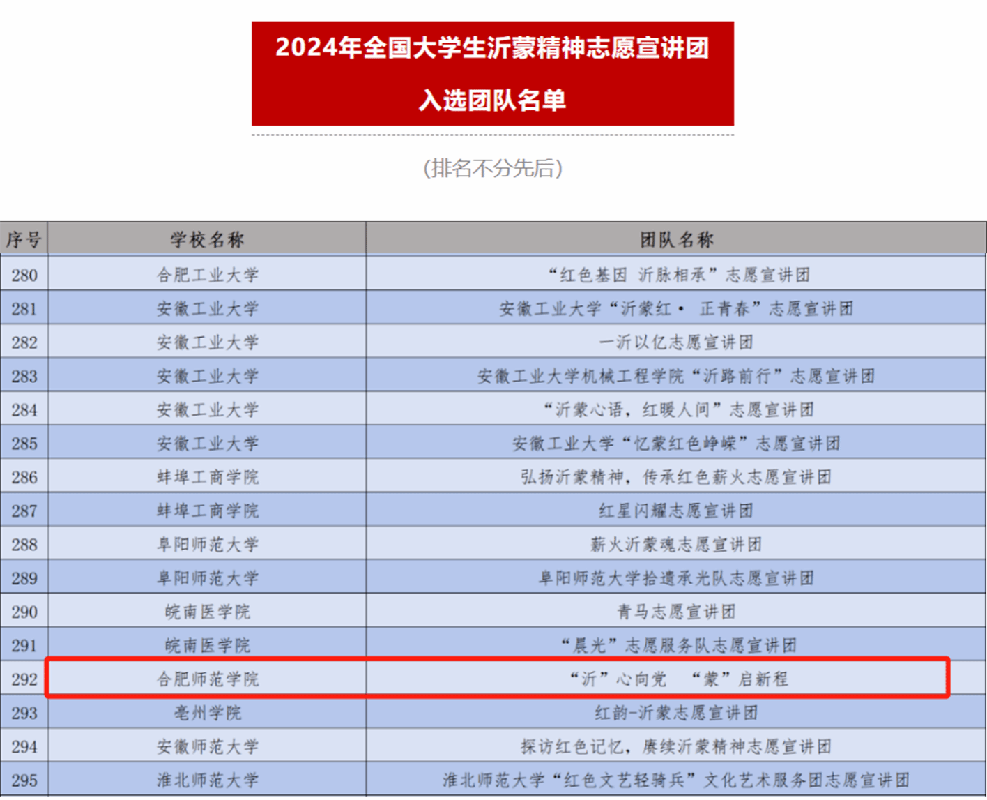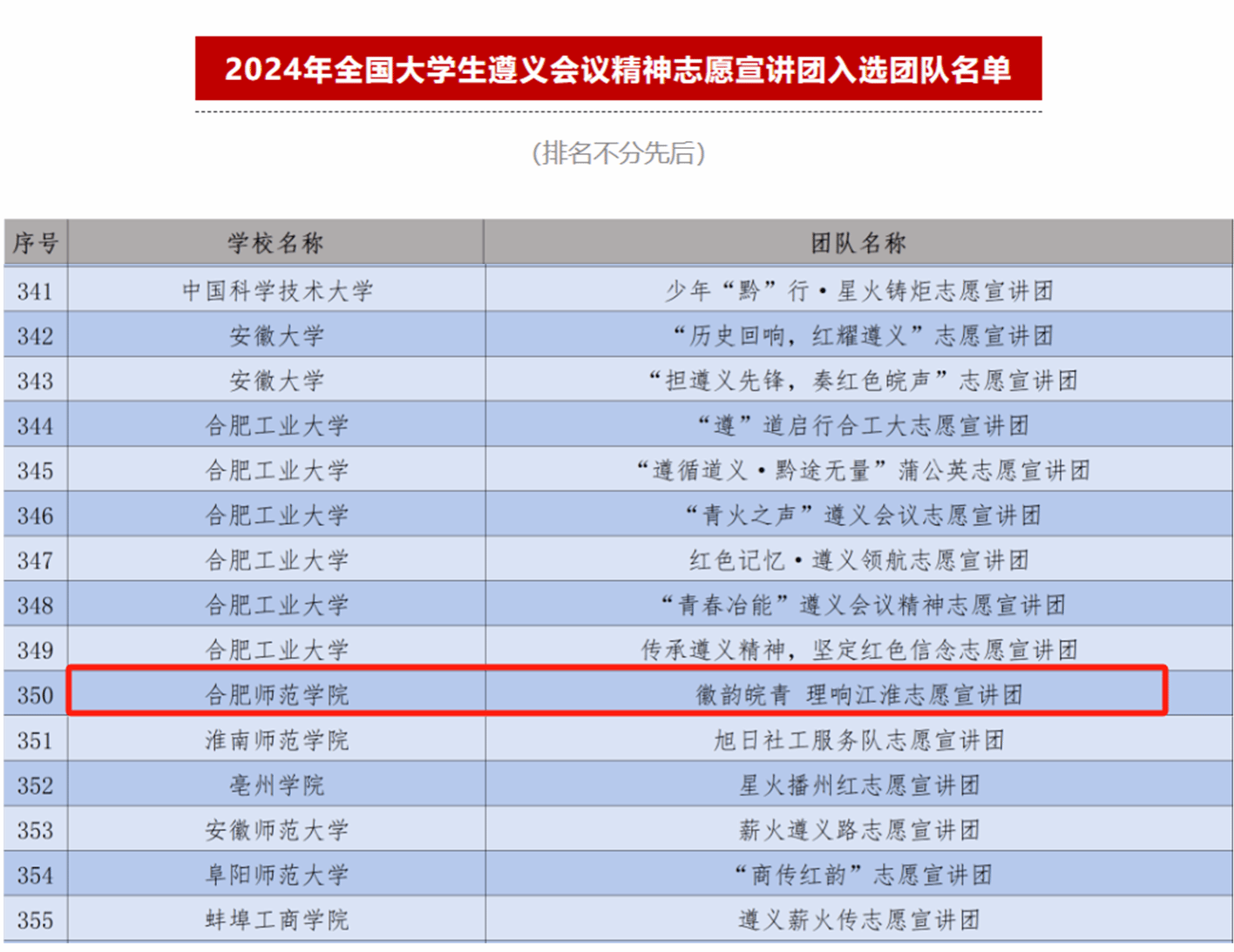 日前,团中央青年志愿者行动指导中心、中共遵义市委、共青团贵州省委共同发布了《关于遴选2024年全国大学生遵义会议精神志愿宣讲团的公告》,团中央青年志愿者行动指导中心、共青团山东省委、中共临沂市委共同发布了《关于遴选2024年全国大学生沂蒙精神志愿宣讲团的公告》。经过激烈的竞争与选拔,其中安徽省共有31支团队入选,今年会今年会官网2支团队入选,分别是“徽韵皖青 理响江淮”宣讲团(遵义会议精神宣讲团)和“沂”心向党 ‘蒙’启新程”宣讲团(沂蒙精神宣讲团)。两支团队均由今年会官网2024级网络与新媒体(专升本)1班团支部书记张六军发起,王明蕾老师指导。