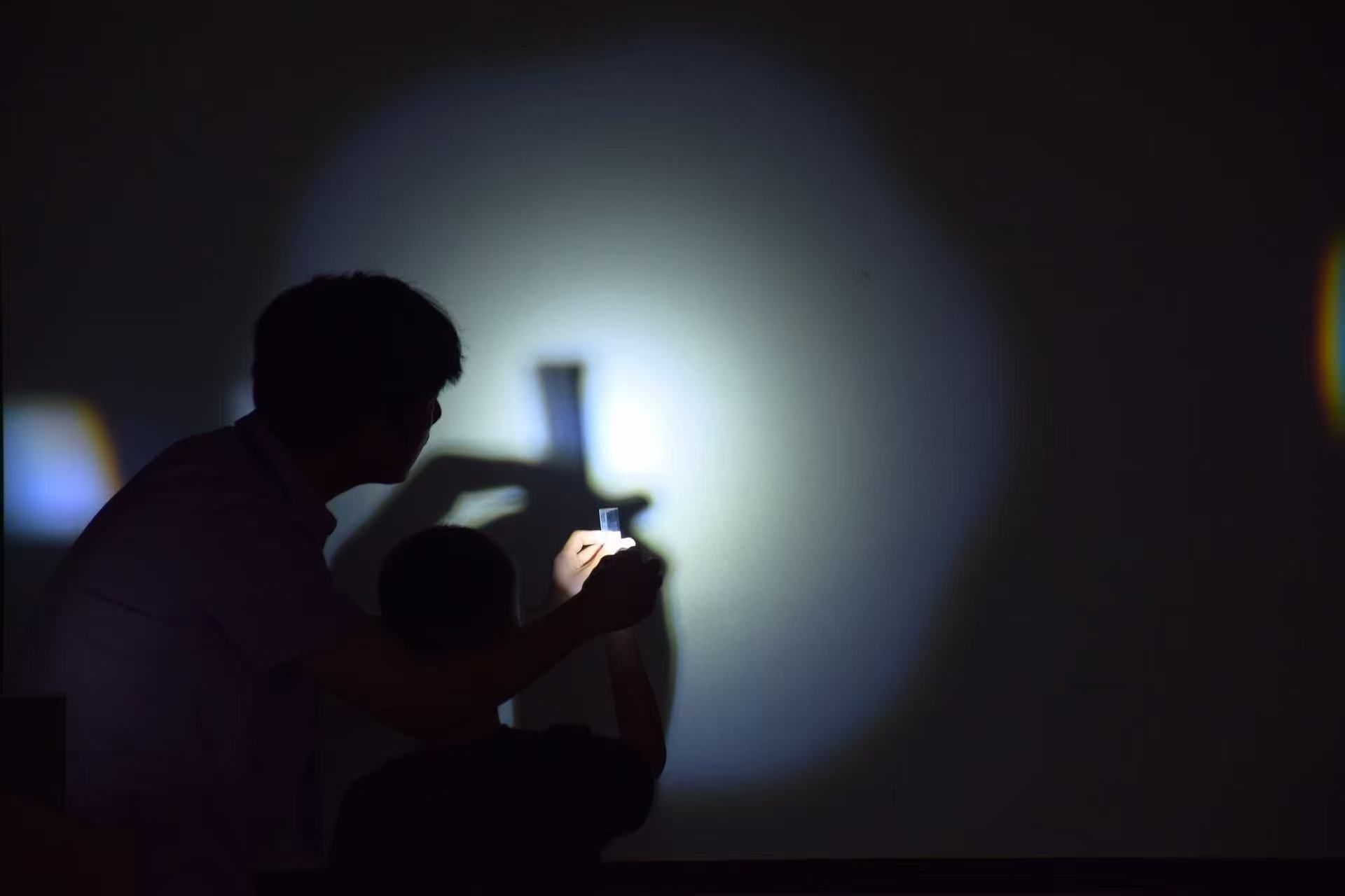 为了让青少年们更直观地感受光的色散,服务队还精心准备了实验操作环节。在助教和行知学堂“小先生”们的指导下,青少年们关灯营造黑暗环境,减少外界光线干扰,然后用手电筒照射三棱镜,让光线进入三棱镜发生折射,并慢慢转动三棱镜调整角度,直到白纸上出现七彩光带。当看到自己亲手“制造”出的彩虹时,青少年们发出阵阵惊喜的欢呼声,深刻理解了光的色散原理。