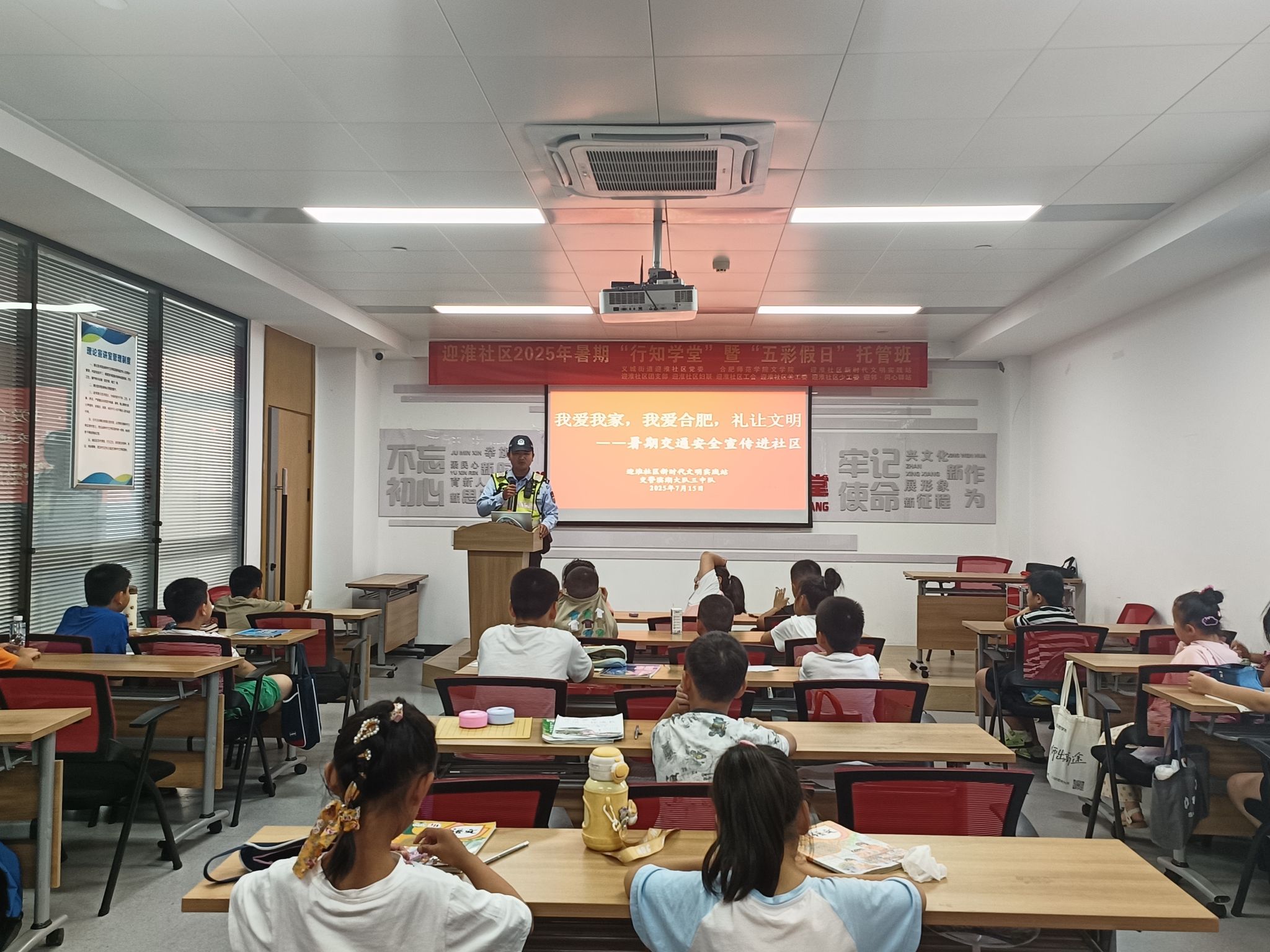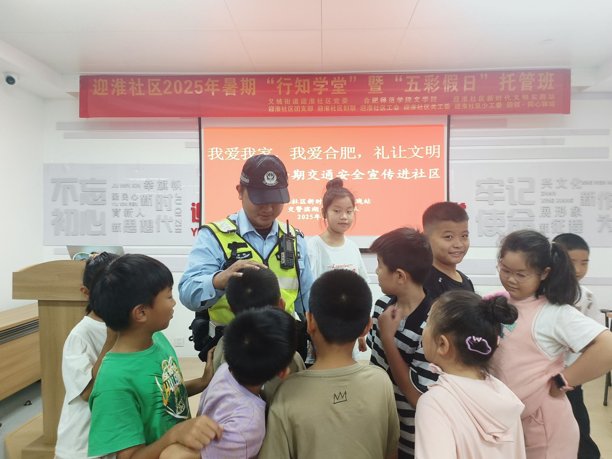 为增强小学员的交通安全意识,培养文明出行的良好习惯,7月15日,迎淮社区新时代文明实践站联合交警滨湖大队三中队,在行知学堂举办了一场别开生面的“我爱我家,我爱合肥,礼让文明”暑期交通安全宣传活动。行知学堂作为迎淮社区重要的教育平台,一直致力于为社区青少年提供丰富多彩的学习与实践机会,此次活动便是学堂暑期系列活动中的一场重头戏。
