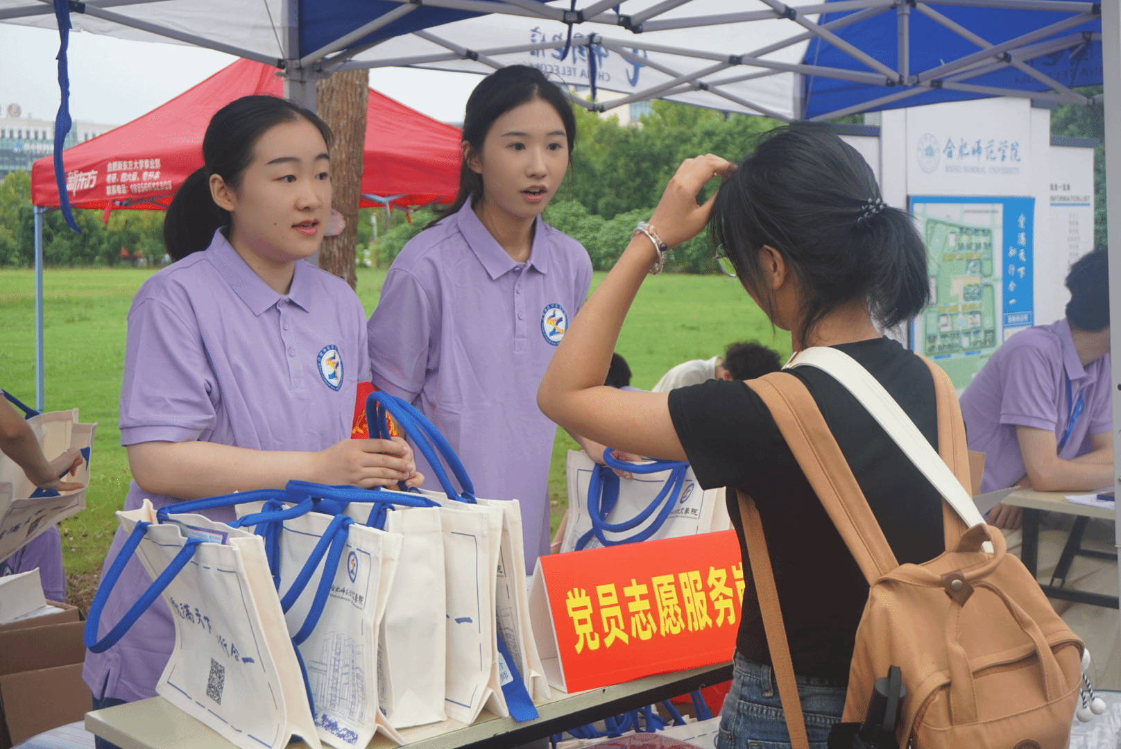 在报到现场,“党员志愿服务岗”的袖章格外醒目。党员志愿者们亮身份、作表率,面对新生关于报到流程的疑问、专业学习的困惑,始终耐心细致解答,用严谨的态度与饱满的热情诠释着党员的责任与担当;报到处的工作人员早已将信息材料梳理得井井有条,双手接过新生的录取通知书时,脸上的微笑与娴熟的核验动作相得益彰,用高效服务为新生缩短等待时光;物资发放处前,印有文院标识的迎新礼包整齐码放,志愿者们双手递出礼包时,还不忘轻声叮嘱使用细节,让每份礼包都满载着学院的关怀与期许。