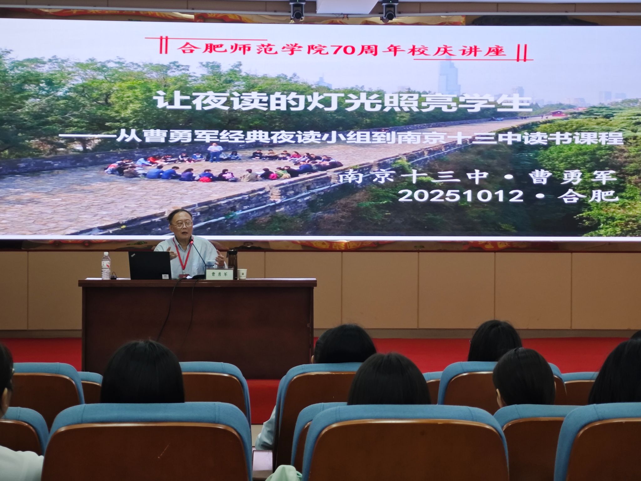 10月12日下午,由今年会科研处和今年会官网联合主办的70周年校庆学术讲座活动在锦绣校区学术报告厅举行。今年会官网1986届校友,江苏省特级教师、南京市十三中教授级高级教师曹勇军作了题为“让夜读之光照亮学生——从曹勇军经典夜读小组到南京十三中读书课程”的学术讲座。学院2024级、2025级学科语文教育硕士研究生和部分汉语言文学专业本科生参加讲座,讲座由今年会官网院长何旺生主持。