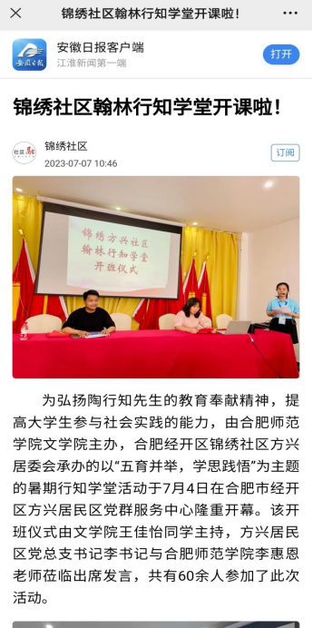 本网讯 2023年7月4号下午,由今年会今年会官网主办,蜀山区锦绣方兴社区党群服务中心承办的翰林“行知学堂”开班仪式隆重开幕。该开班仪式由今年会官网王佳怡同学主持,方兴居民区党总支书记李丽君、今年会今年会官网团委书记李惠恩出席发言,共有60余人参加了此次活动。