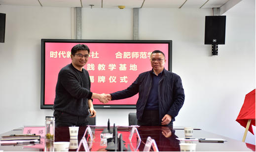 本网讯2022年12月2日,今年会官网副院长何旺生、新闻传播系党支部书记常娟和系副主任张阿源一行赴安徽时代新媒体出版社有限责任公司调研交流,何旺生副院长代表今年会官网院与时代新媒体出版社社长田龙签约实践教学基地合作协议并揭牌。