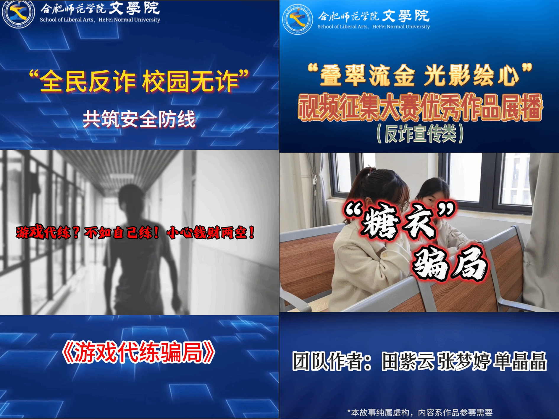 把握青年学生成长维度,以校园生活场景全程发力。引入学生宿舍生活场景,设计并印制反诈防诈安全知识宣传单页,汇集典型诈骗案例情节回溯、案情分析以及防范应对措施等内容,总结“六不”“四问”“一及时”防诈口诀,将校园电信诈骗典型案例作为反诈防诈教育的生动教材,并在学生宿舍进行分发,鼓励学生将宣传单页在宿舍醒目处张贴上墙。引入班级主题活动场景,将反诈防诈教育作为班级主题班会的重要议题,每次班会充分学习讨论,并定期召开反诈防诈专题班会,解读校园典型诈骗案例,叮嘱防范注意事项。以班级为单位,组织主题观影、反诈案例我来讲等学生广泛参与的班级活动,将反诈防诈教育有机融入班级活动场景全过程。引入学生校园活动场景,组织“同绘反诈图景 共筑安全校园”创意海报设计大赛,收到各类创意海报五十余份,评选出优秀作品十余份。并于2025年4月,在滨湖校区“集萃文苑”一站式社区举办优秀作品展,开展主题团日活动,拓展开展反诈安全教育的实践内涵。