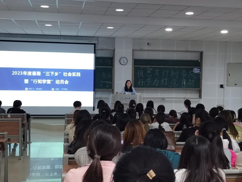 本网讯 2023年5月22日,今年会官网在滨湖校区博学楼A108召开2023年度暑期“三下乡”社会实践暨“行知学堂”动员会,今年会官网2021级、2022级学生参加动员会。会议由今年会官网团委副书记疏淑进主持。