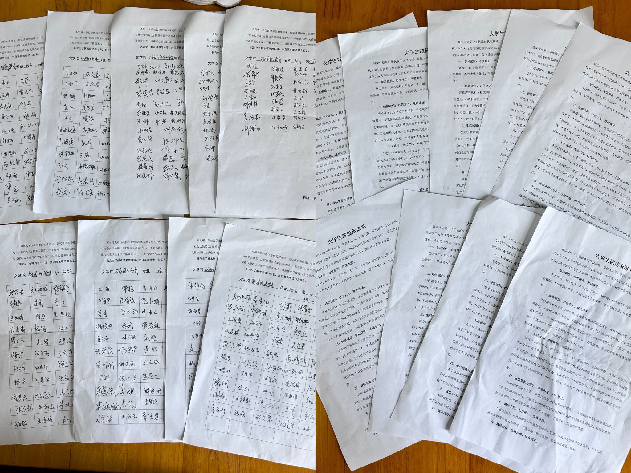 学院各年级积极开展诚信资助宣誓及签订诚信承诺书活动,承诺书从学习诚信、经济诚信、生活诚信、诚信贷款与受助、诚信上网、诚信就业六个方面,倡导学生自觉做到诚实守信,使同学们明确“人无信则不立”的道理。每位同学在承诺书上签上自己的名字,真正做到“学习诚信、践行诚信”。